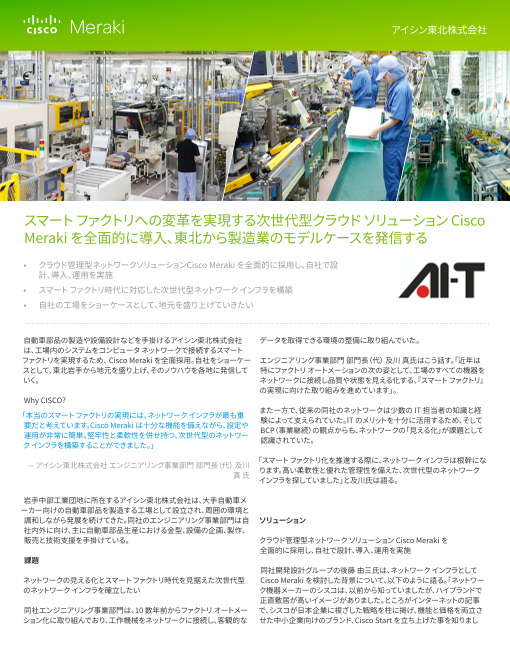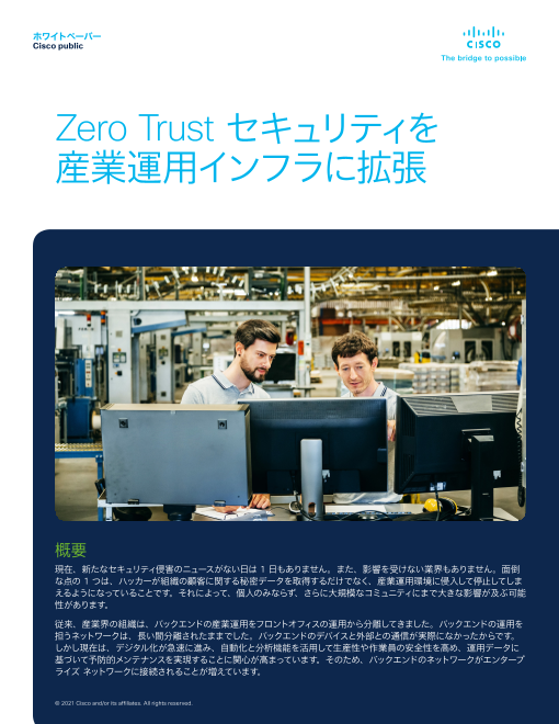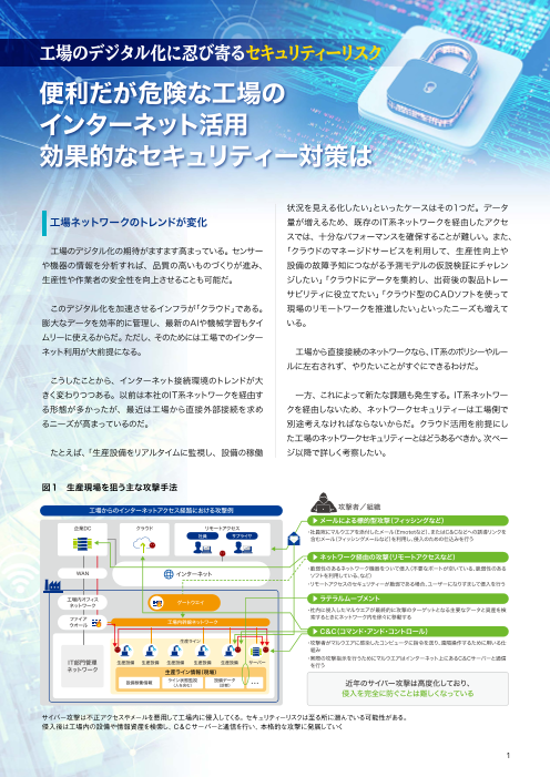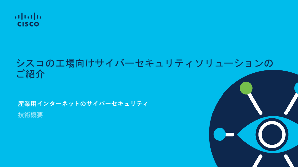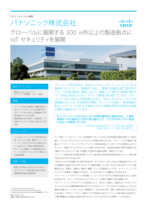 パナソニック株式会社様はネットワーク レベルのセキュリティ対策を優先的に進めるなど、工場の 実情を十分に踏まえた方針で取り組む上で、シスコのセキュリティ技術を採用しました。本資料はパナソニック株式会社様の導入事例を詳細紹介です。