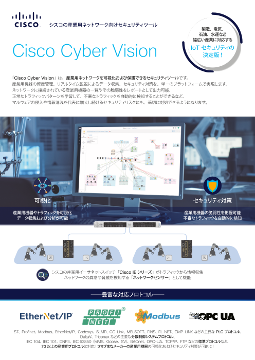 「Cisco Cyber Vision」は、産業用ネットワークを可視化および保護できるセキュリティツールです。 産業用機器の資産管理、リアルタイム監視によるデータ収集、セキュリティ対策を、単一のプラットフォームで実現します。 ネットワークに接続されている...