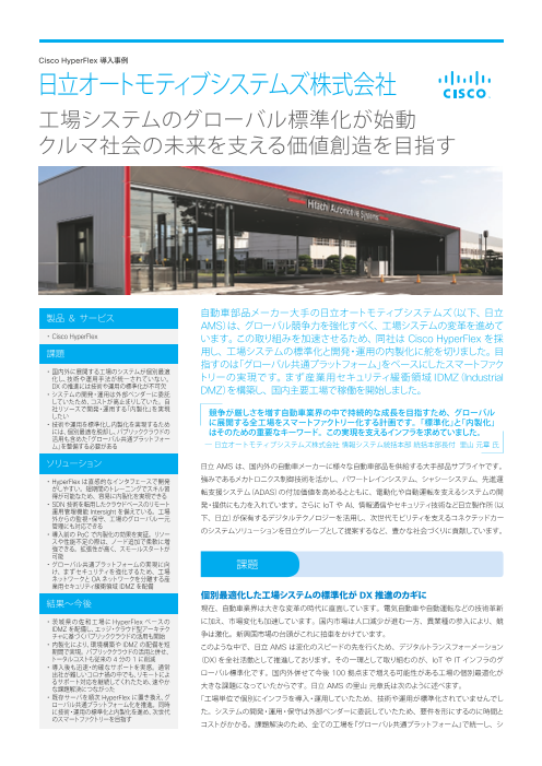 自動車部品メーカー大手の日立オートモティブシステムズ(以下、日立AMS)は、グローバル競争力を強化すべく、工場システムの変革を進めています。この取り組みを加速させるため、同社は Cisco HyperFlex を採用し、工場システムの標準化と開発・運用の...