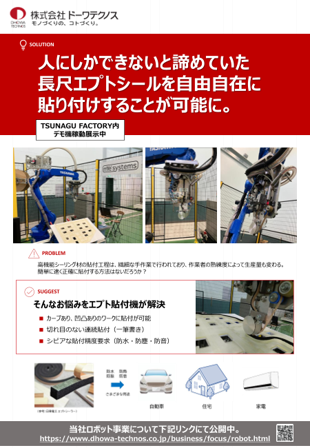 【エプトシール貼付機の特長】 ・カーブあり、凹凸ありのワークに貼付 ・切れ目のない連続貼付(一筆書き) ・長尺でも均一に貼付(防水・防塵・防音)