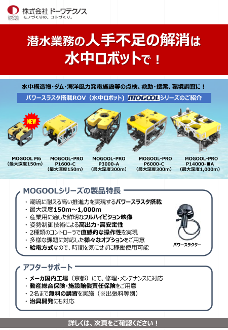 水上設備や船舶の定期点検は、潜水士による作業で行っているかと思います。 高齢化・減少する潜水士、設備の老朽化、大きく変動する海洋環境に対応すべく 誰でも気軽に安全な水中作業をする手段をご提供するためのソリューション提案となります。 弊社ではロボ...
