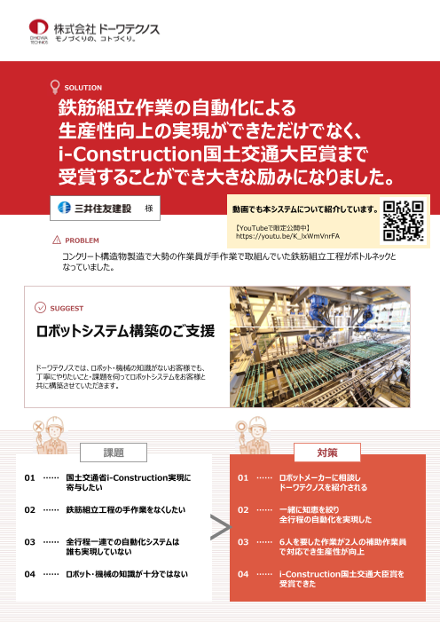 ・鉄筋組立工程の85%の作業を自動化でき、3倍の生産性工場を実現! ・作業現場の人員コストを、6人から2人にまで省人化! 詳細の事例については、事例カタログをご確認ください。 ドーワテクノスでは、ロボット・機械の知識がないお客様でも、丁寧にやり...