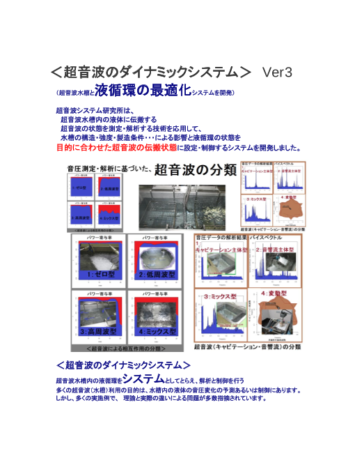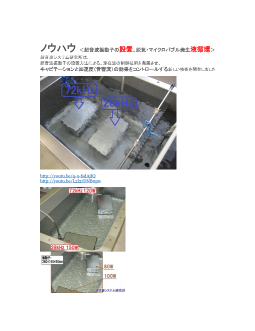 ノウハウ <超音波振動子の設置、脱気・マイクロバブル発生液循環> 超音波システム研究所は、 超音波振動子の設置方法による、定在波の制御技術を発展させ、 キャビテーションと加速度(音響流)の効果をコントロールする 新しい技術を開発しました ...