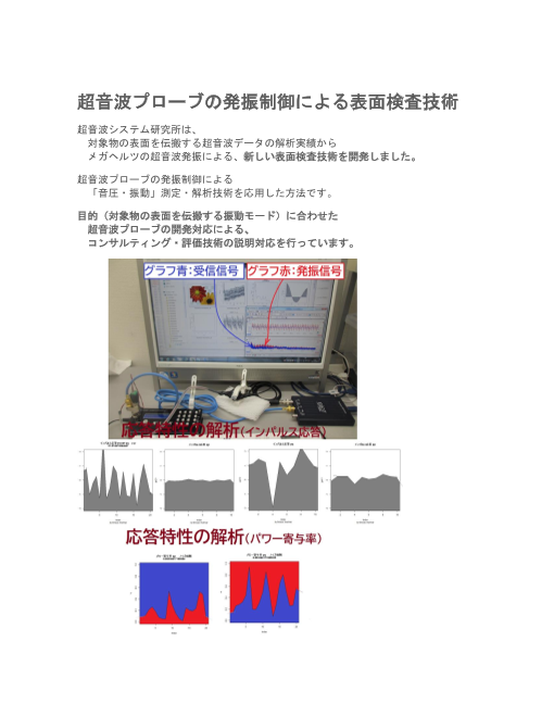 超音波システム研究所は、 対象物の表面を伝搬する超音波データの解析実績から メガヘルツの超音波発振による、新しい表面検査技術を開発しました。 超音波プローブの発振制御による 「音圧・振動」測定・解析技術を応用した方法です。 目的(...