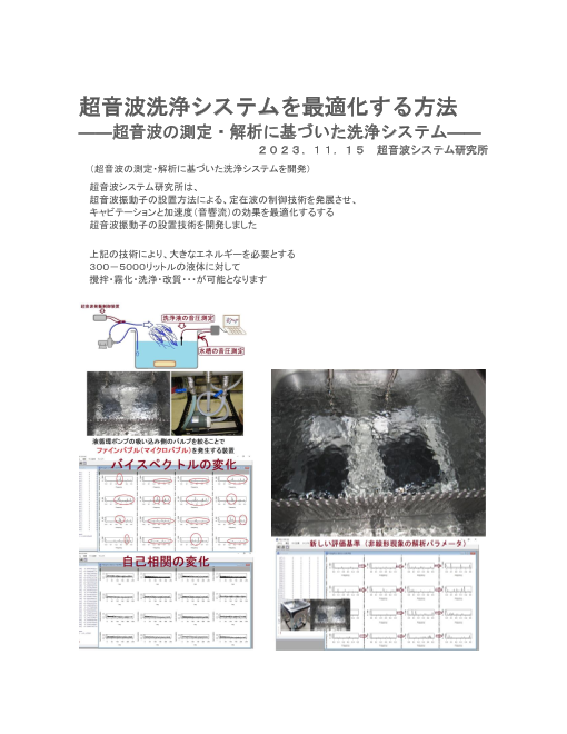 超音波システム研究所は、 オリジナル超音波システム(音圧測定解析・発振制御)による、 超音波伝搬状態の各種解析結果を、 抽象代数モデルに基づいて、超音波振動の相互作用を最適化(注)する、 超音波<ダイナミック制御>技術を開発しました。 ...