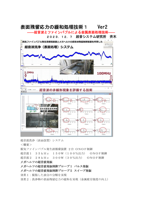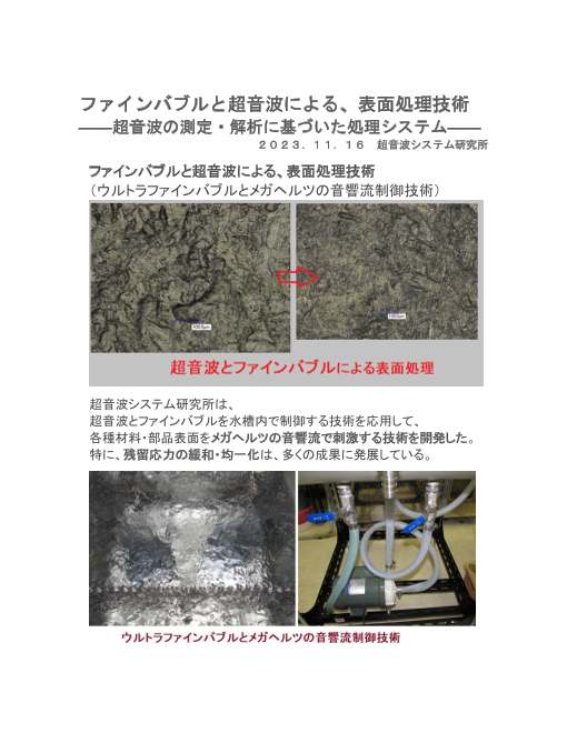 超音波システム研究所は、 超音波とファインバブルを水槽内で制御する技術を応用して、 各種材料・部品表面をメガヘルツの音響流で刺激する技術を開発した。 特に、残留応力の緩和・均一化は、多くの成果に発展している。 <<脱気ファインバブル(マイクロ...