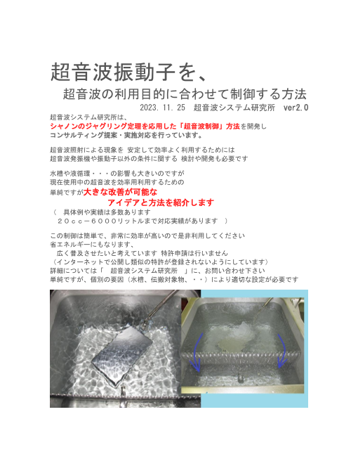 超音波システム研究所は、 シャノンのジャグリング定理を応用した「超音波制御」方法を開発し コンサルティング提案・実施対応を行っています。 超音波照射による現象を 安定して効率よく利用するためには 超音波発振機や振動子以外の条件に関する 検討や...