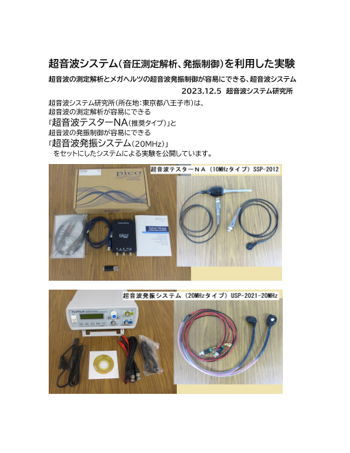 超音波の測定解析と発振制御が容易にできる、超音波システム 超音波システム研究所(所在地:東京都八王子市)は、 超音波の測定解析が容易にできる 「超音波テスターNA(推奨タイプ)」と 超音波の発振制御が容易にできる 「超音波発振システム(20...