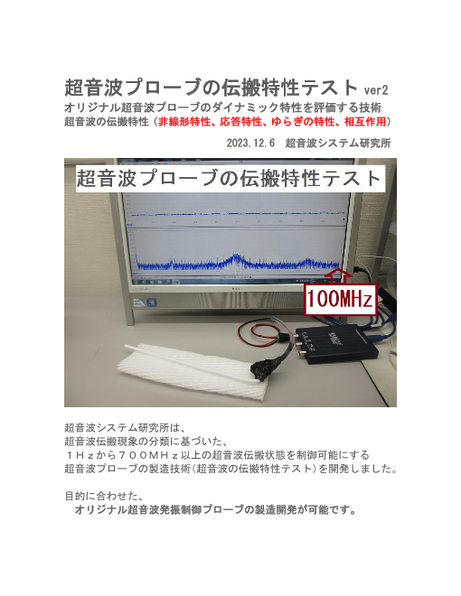 超音波システム研究所は、 超音波伝搬現象の分類に基づいた、 1Hzから700MHz以上の超音波伝搬状態を制御可能にする 超音波プローブの製造技術(超音波の伝搬特性テスト)を開発しました。 目的に合わせた、 オリジナル超音波発振制御プローブ...