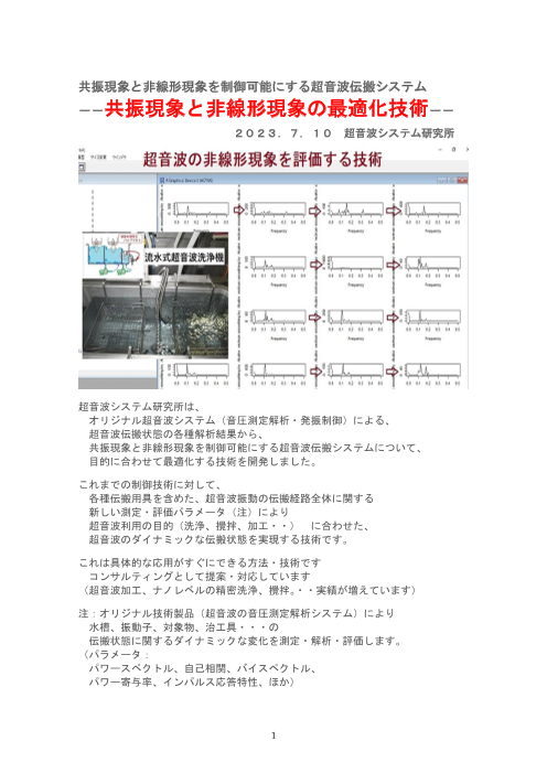 超音波システム研究所は、 オリジナル超音波システム(音圧測定解析・発振制御)による、 超音波伝搬状態の各種解析結果から、 共振現象と非線形現象を制御可能にする超音波伝搬システムについて、 目的に合わせて最適化する技術を開発しました。 ...