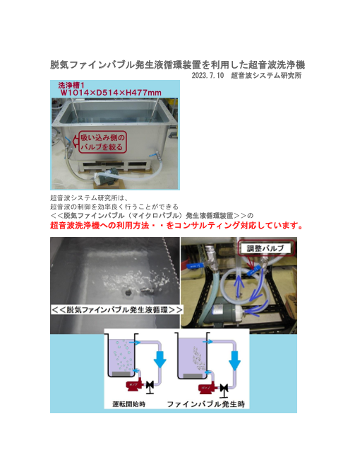 超音波システム研究所は、 超音波の制御を効率良く行うことができる <<脱気ファインバブル(マイクロバブル)発生液循環装置>>による 超音波洗浄機の製造・開発方法・・をコンサルティング対応しています。 <<脱気ファインバブル(マイクロバブル)発...