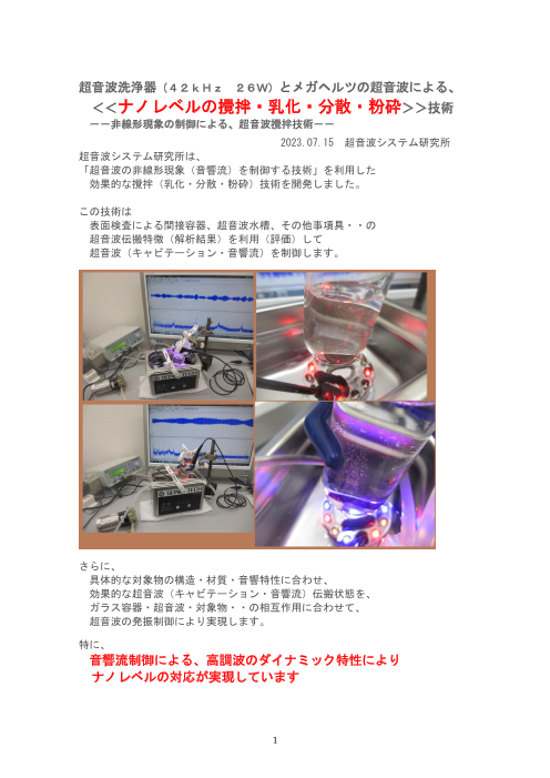 超音波洗浄器(42kHz 26W)とメガヘルツの超音波による、 <<ナノレベルの攪拌...