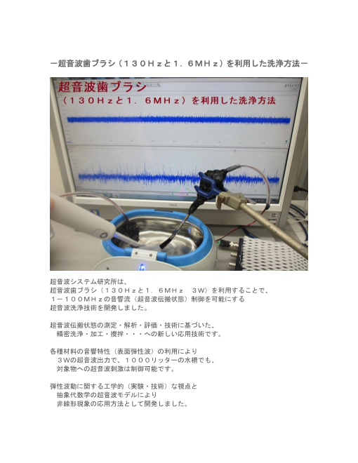 超音波システム研究所は、 超音波歯ブラシ(130Hzと1.6MHz 3W)を利用することで、 1-100MHzの音響流(超音波伝搬状態)制御を可能にする 超音波洗浄技術を開発しました。 超音波伝搬状態の測定・解析・評価・技術に基づいた、 ...