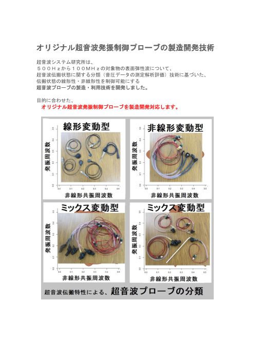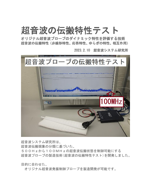 超音波システム研究所は、 <超音波伝搬特性(音響特性)の分類>に基づいた、 500Hzから100MHzの超音波伝搬状態を制御可能にする 超音波の伝搬特性テスト(超音波プローブの製造技術)を開発しました。 目的に合わせた、 オリジナル超音波...