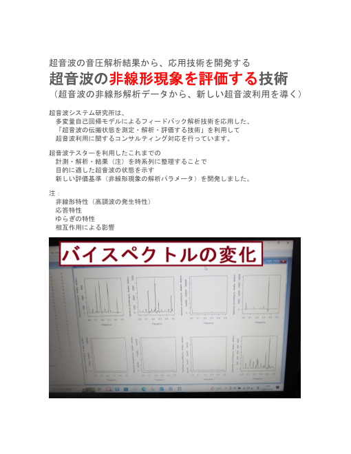 超音波システム研究所は、 多変量自己回帰モデルによるフィードバック解析技術を応用した、 「超音波の伝搬状態を測定・解析・評価する技術」を利用して 超音波利用に関するコンサルティング対応を行っています。 超音波テスターを利用したこれまでの...