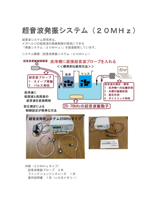 超音波発振システム(20MHz)の製造販売 超音波システム研究所は、 メガヘルツの超音波の発振制御が容易にできる 「発振システム(20MHz)」を製造販売しています。 システム概要(超音波発振システム(20MHz)) 内容(20M...