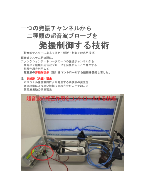 (超音波テスターによる<測定・解析・制御>の応用技術) 超音波システム研究所は、 ファンクションジェネレータの一つの発振チャンネルから 同時に2種類の超音波プローブを発振することで発生する 相互作用を利用して 超音波の非線形現象(注)...
