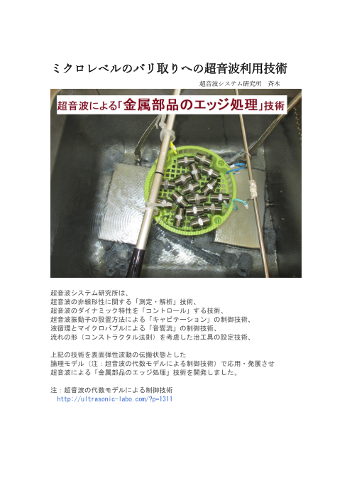 超音波システム研究所は、 超音波とファインバブルを水槽内で制御する技術を応用して、 各種材料・部品表面をメガヘルツの音響流で刺激する技術を開発した。 特に、表面残留応力の均質化は、多くの成果に発展している。 <<脱気ファインバブル(...