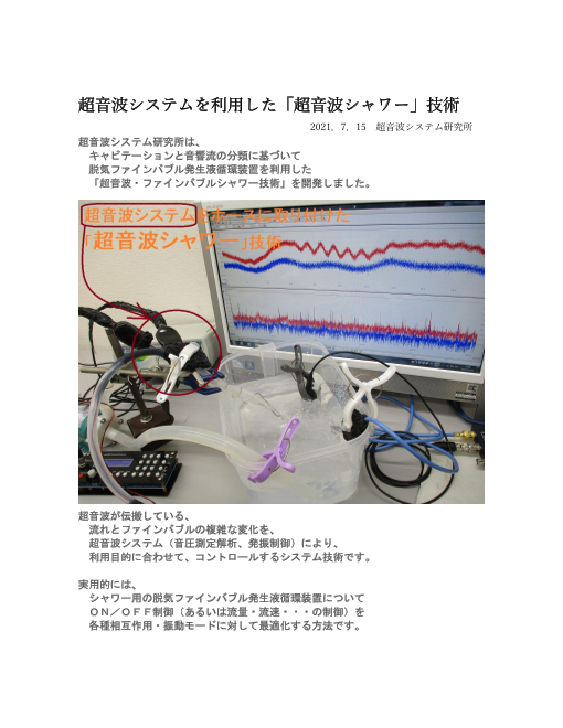 (超音波テスターによる<測定・解析・制御>の応用技術) 超音波システム研究所(所在地:東京都八王子市)は、 キャビテーションと音響流の分類に基づいて 脱気ファインバブル発生液循環装置を利用した 「超音波・ファインバブルシャワー技術」を開...