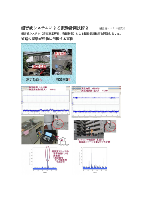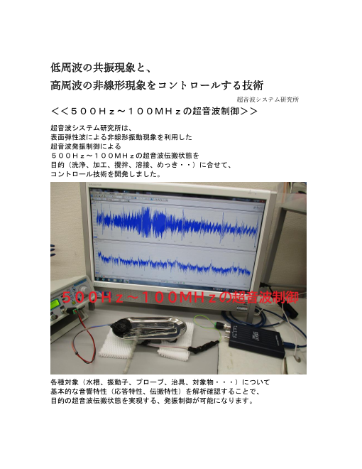 超音波システム研究所(所在地:東京都八王子市)は、 オリジナル製品(超音波テスター)を利用した全く新しい、 <<振動計測技術>>を開発しました。 これまでに開発した、超音波の音圧測定解析技術について、 超音波の非線形現象に関する「測定・解...