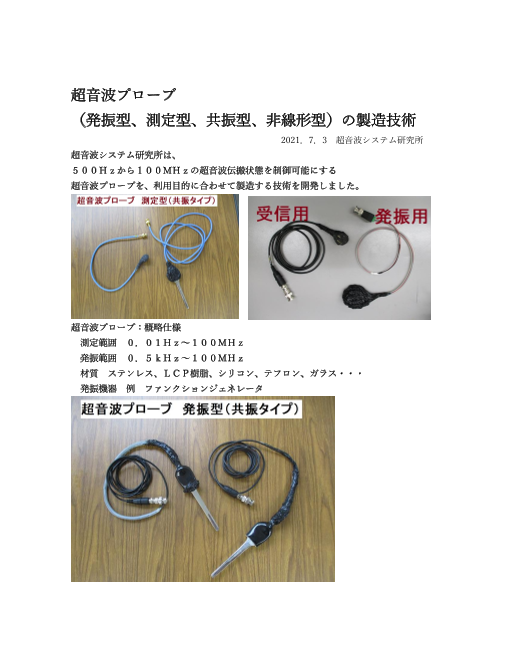 超音波システム研究所は、 500Hzから100MHzの超音波伝搬状態を制御可能にする 超音波プローブを、利用目的に合わせて製造する技術を開発しました。 超音波プローブ:概略仕様 測定範囲 0.01Hz~100MHz 発振範囲 0.5kH...
