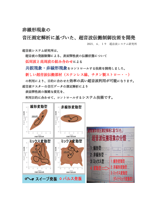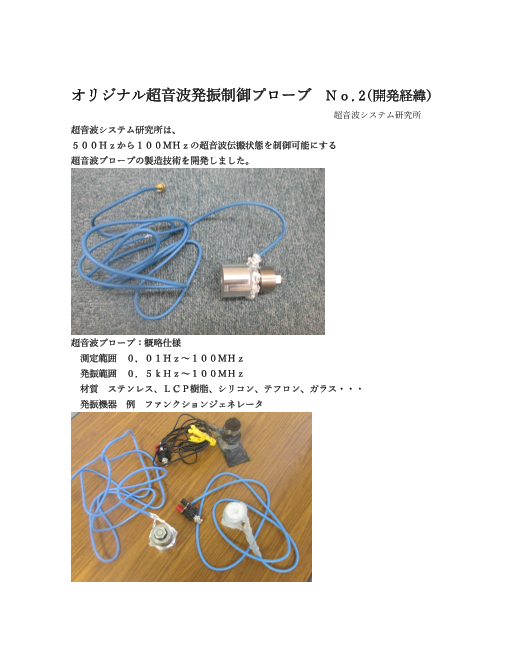 超音波システム研究所は、 超音波の発振制御による、表面弾性波の伝搬状態について 低周波と高周波の組み合わせによる 共振現象・非線形現象をコントロールする技術を開発しました。 新しい超音波伝搬部材(ステンレス線、チタン製ストロー・・) ...