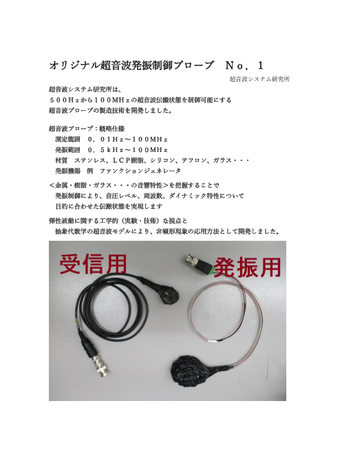 超音波システム研究所は、 500Hzから100MHzの超音波伝搬状態を制御可能にする 超音波プローブの製造技術を開発しました。 超音波プローブ:概略仕様 測定範囲 0.01Hz~100MHz 発振範囲 0.5kHz~100MHz 材...