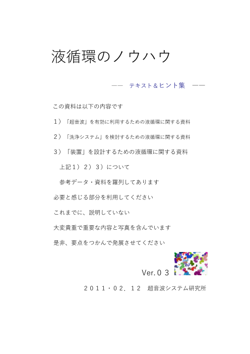 液循環のノウハウ 2011・02.12 ―― テキスト&ヒント集 ―― この資料は以下の内容です 1)「超音波」を有効に利用するための液循環に関する資料 2)「洗浄システム」を検討するための液循環に関する資料 3)「装置」を設計するための液循...