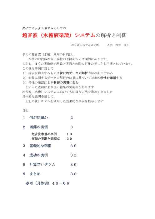 超音波(液循環)システム の解析と制御 2011・01.15 多くの超音波(水槽)利用の目的は、 水槽内の液体の音圧変化の予測あるいは制御にあります。 しかし、多くの実施例で理論と実際との間の距離の著しさも指摘されています。 この様な事例に対...