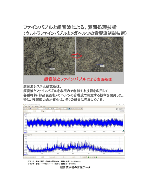 超音波システム研究所は、 超音波とファインバブルを水槽内で制御する技術を応用して、 各種材料・部品表面をメガヘルツの音響流で刺激する技術を開発した。 特に、残留応力の均質化は、多くの成果に発展している。 ◆詳細はカタログをダウンロードしご覧い...