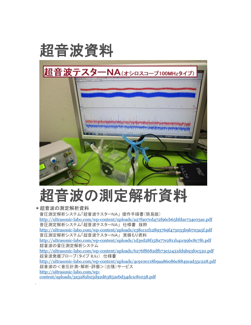 システム概要(推奨システム::超音波テスターNA) 1.価格 198,000円(税込:消費税10%) 2.内容 超音波洗浄機の音圧測定専用プローブ 1本 超音波測定汎用プローブ 1本 オシロスコープセット 1式 解析...