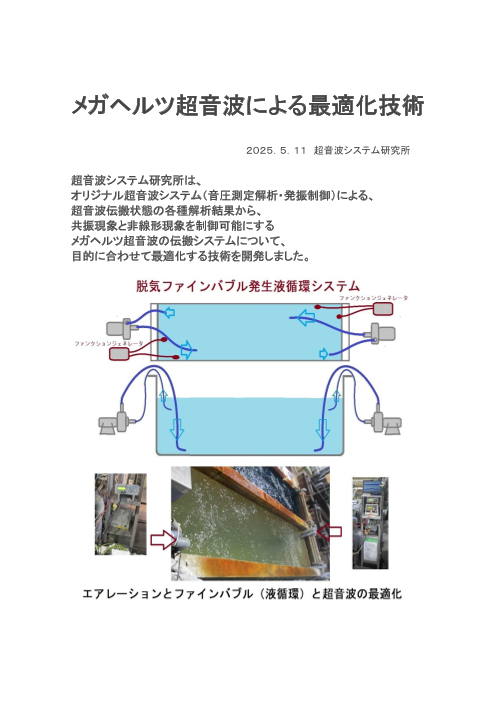 超音波システム研究所は、 ポータブル超音波洗浄器と 超音波プローブによるメガヘルツの発振制御の組み合わせにより 「超音波の非線形現象(音響流)を制御する技術」を開発しました。 この技術は 変化する超音波の音圧データ(非線形)解析に基づ...