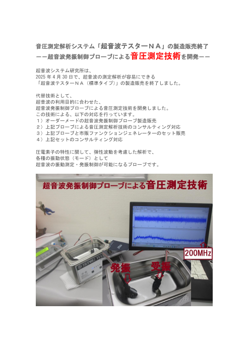 超音波システム研究所(所在地:東京都八王子市)は、 2025年4月30日で、超音波の測定解析が容易にできる 「超音波テスターNA(標準タイプ)」の製造販売を終了しました。 代替技術として、 超音波の利用目的に合わせた、 超音波発振制御プロー...