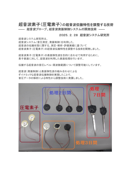 超音波システム研究所は、 超音波システム(音圧測定、発振制御)を利用した、 超音波の伝搬状態に関する、測定・解析・評価実績に基づいて 超音波素子(圧電素子)の超音波伝搬特性を調整する技術を開発しました。 超音波素子(圧電素子)の表面弾性波を目...