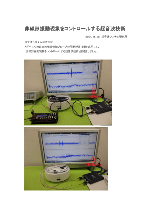 超音波システム研究所は、 メガヘルツの超音波発振制御プローブの開発製造技術を応用して、 「非線形振動現象をコントロールする超音波技術」を開発しました。 超音波伝搬状態の測定・解析・評価技術に基づいた、 オリジナル非線形共振現象(注1)の制御に...
