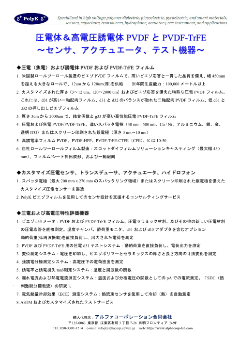 ◆圧電(焦電)および誘電体PVDFおよびPVDF-TrFEフィルム ◆カスタマイズ圧電センサ、トランスデューサ、アクチュエータ、ハイドロフォン ◆圧電および高電圧特性評価機器 ◆詳細はカタログをダウンロードしご覧いただくか、お気軽にお問い合わせ...
