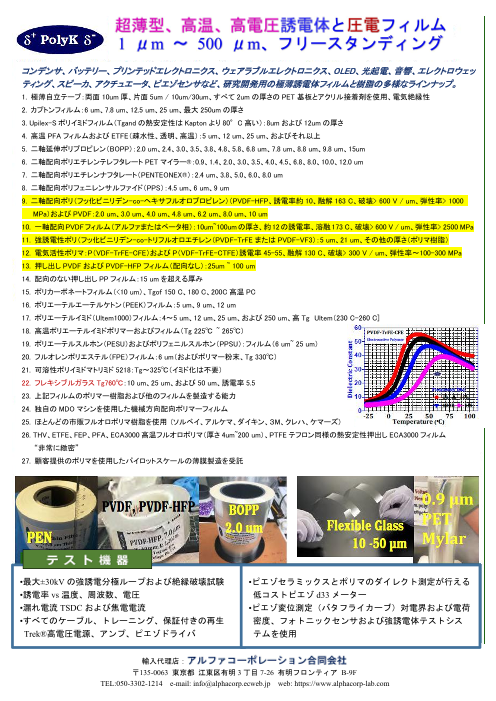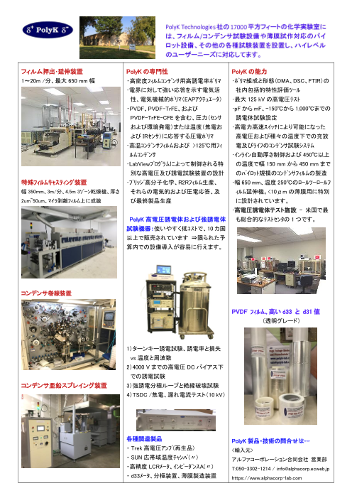 <PolyKの専門性> ・高密度フィルムコンデンサ用高誘電率ポリマ ・電界に対して強い応答を示す電気活性、電気機械的ポリマ(EAPアクチュエータ) ・PVDF、PVDF-TrFE、およびPVDF-TrFE-CFEを含む、圧力(センサおよび環境...