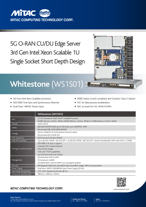 【WS1S01】は、MiTAC Whitestone 5G CU/DU エッジ サーバーです。 ≪特徴≫ ・奥行きの短い1Uラックマウントシャーシ ・NEBS 屋内レベル3認定取得 および屋外クラス2 要件 ・Intel Mount Bryce ...