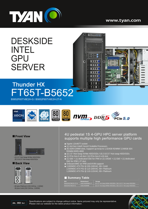 Thunder HX【FT65T-B5652】は、6 LFF & 2 NVMe U.2 ベイ付き、1S プロフェッショナル ワークステーション / ペデスタル デスクサイド HPC サーバーです。(B5652F65TV6E2H-G / B5652F65T...