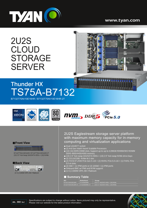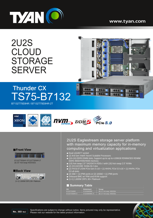 Thunder HX【TS75A-B7132】は、16 NVMe U.2 + 10 SATA (高 IOP)、2U2S HPC/VM/Warm ストレージ サーバーです。(B7132T75AV10E16HR / B7132T75AV10E16HR-2T)...