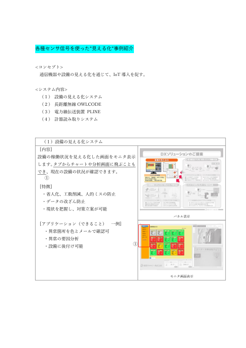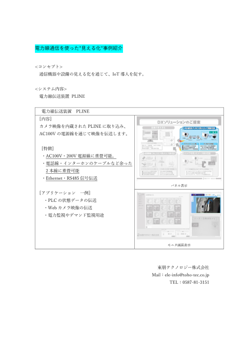 【導入事例】 ■見える化システム ・省人化・工数削減・人的ミス ・データ改ざん防止 ・現状を把握し、対策立案が可能 ■電力線伝送を用いたカメラ映像の伝送 ・PLCの状態データの伝送 ・Webカメラ映像の伝送 ・電力監視やデマンド監視用...