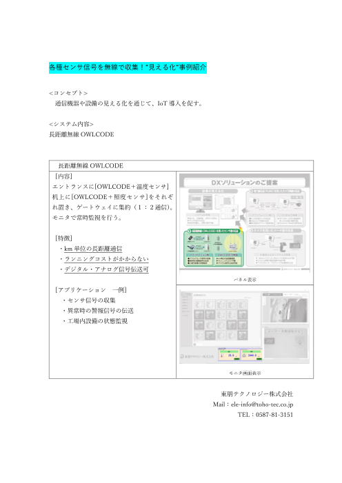 【特徴】 ■見える化システム ・省人化・工数削減・人的ミス ・データ改ざん防止 ・現状を把握し、対策立案が可能 ■長距離無線を用いたセンサ値の伝送 ・アナログセンサ信号を収集し、温度や照度、流量などを画面表示 ・異常時の警報信号の伝送 ...
