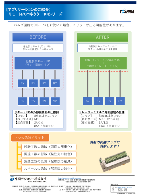 リモートI/Oコネクタ「TKNシリーズ」を採用すれば、 お好みの当社リレーターミナルに接続可能です。 他社リモートI/Oのリレー出力モジュールの外部にさらに別のリレーを配線、そこから外部負荷に接続している場合に効果を発揮します。 「TKNシリーズ」...