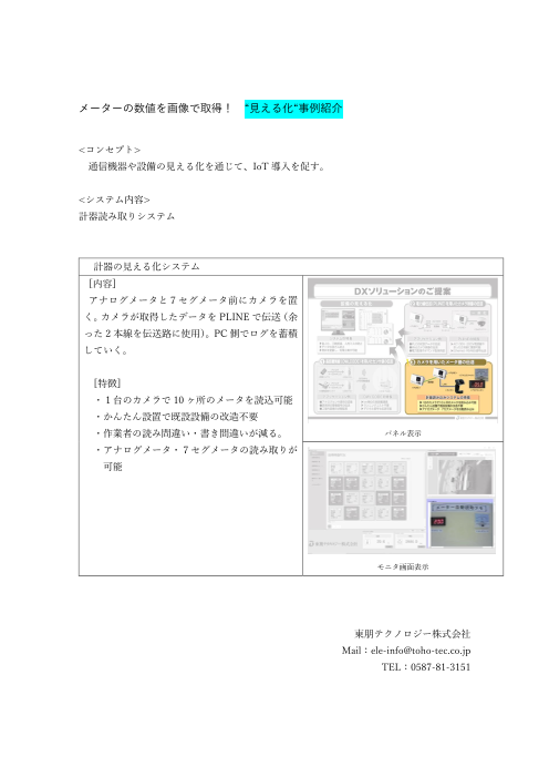 【特徴】 ■見える化システム ・省人化・工数削減・人的ミス ・データ改ざん防止 ・現状を把握し、対策立案が可能 ■カメラを用いたメータ値の伝送 ・1台のカメラで10か所のメータを読み込み可能 ・既設設備の改造不要 ・アナログ・7セグメ...