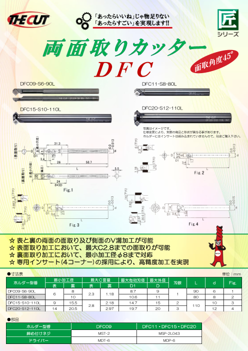 『DFC 両面取りカッター』は、表面取り加工において、最大C2.8までの面取りが可能です。 専用インサート(4コーナー)の採用により、高精度加工を実現します。 【特長】 ■表と裏の両面の面取り及び側面のV溝加工が可能 ■表面取り加工におい...