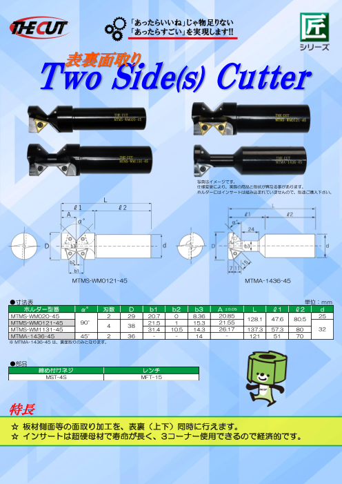 『MTMS-WM』は、板材側面等の面取り加工を、表裏(上下)同時に行えます。 『MTMA』は、裏面取り加工のみ行えます。 インサートは超硬母材で寿命が長く、3コーナー使用できるので経済的です。 ※詳しくはPDF資料をご覧いただくか、お気軽にお問...