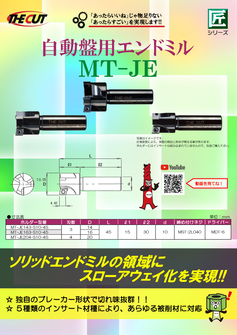 『MT-JE 自動盤用エンドミル』は、ソリッドエンドミルの領域にスローアウェイ化を実現したエンドミルです。 独自のブレーカー形状で切れ味抜群。 3種類のインサート材種により、さまざまな被削材に対応します。 【ラインアップ】 ■MT-JE143...