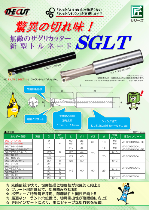 『SGLTNEWトルネード』は、フルート部新形状で、切屑絡みを抑制。ボディーに特殊鋼を採用し、耐摩耗性と剛性を向上しました。 また、好適なクーラント位置で切粉排出性を飛躍的に向上します。 【特長】 ■先端部新形状で切粉処理と切削性が飛躍的に向上...