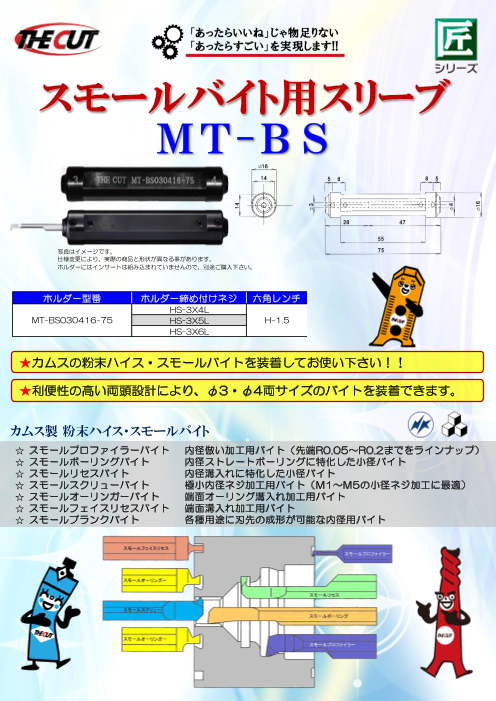 『MT-BS』スモールバイト用スリーブは、利便性の高い両頭設計により、φ3・φ4両サイズのバイトを装着できます。 カムスのハイス・スモールバイトを装着してお使い下さい。 【カムス製スモールバイト】 ■スモールプロファイラーバイト ・内径...