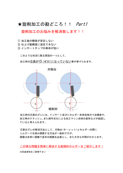 本資料では、旋削加工時に発生する芯高のズレの原因や、その対策での一般的な課題について簡潔に紹介しています。